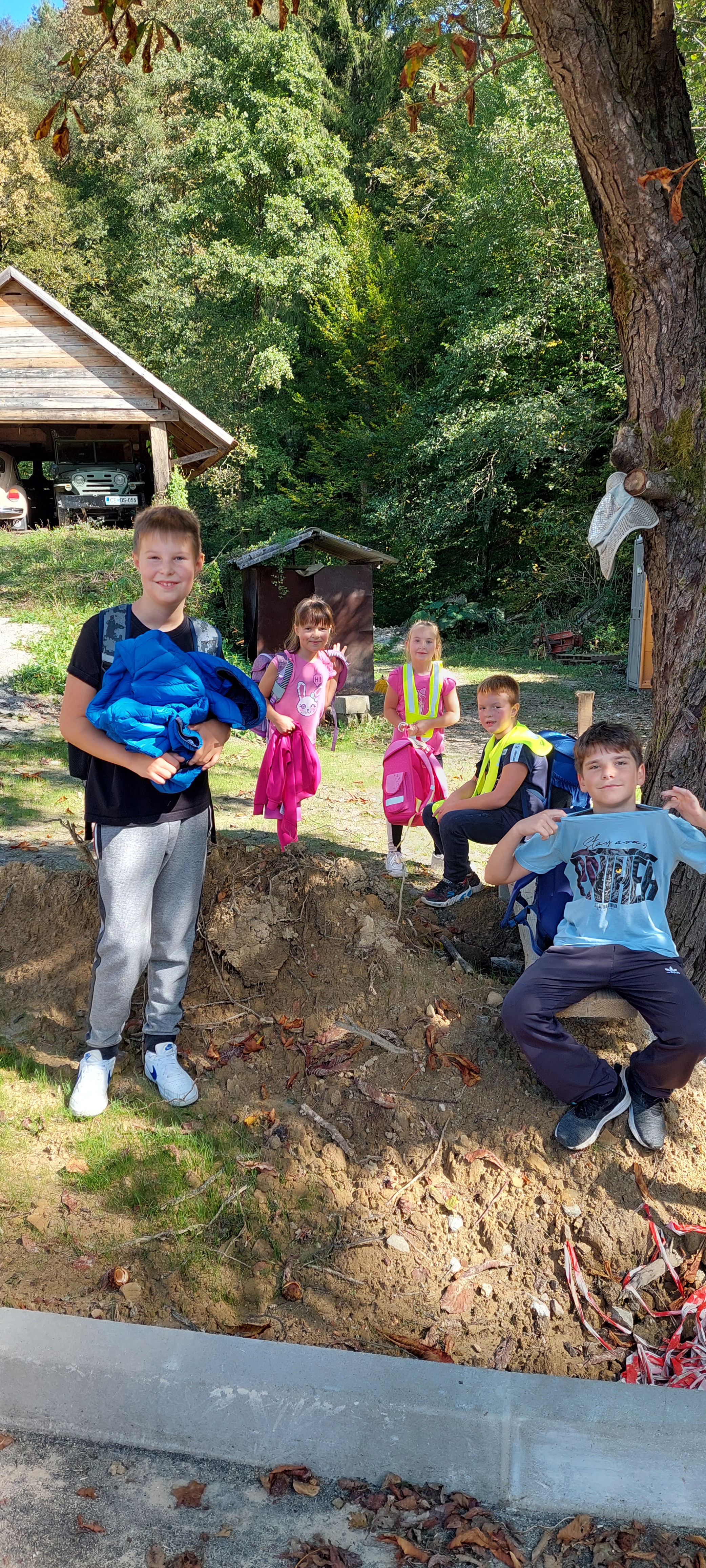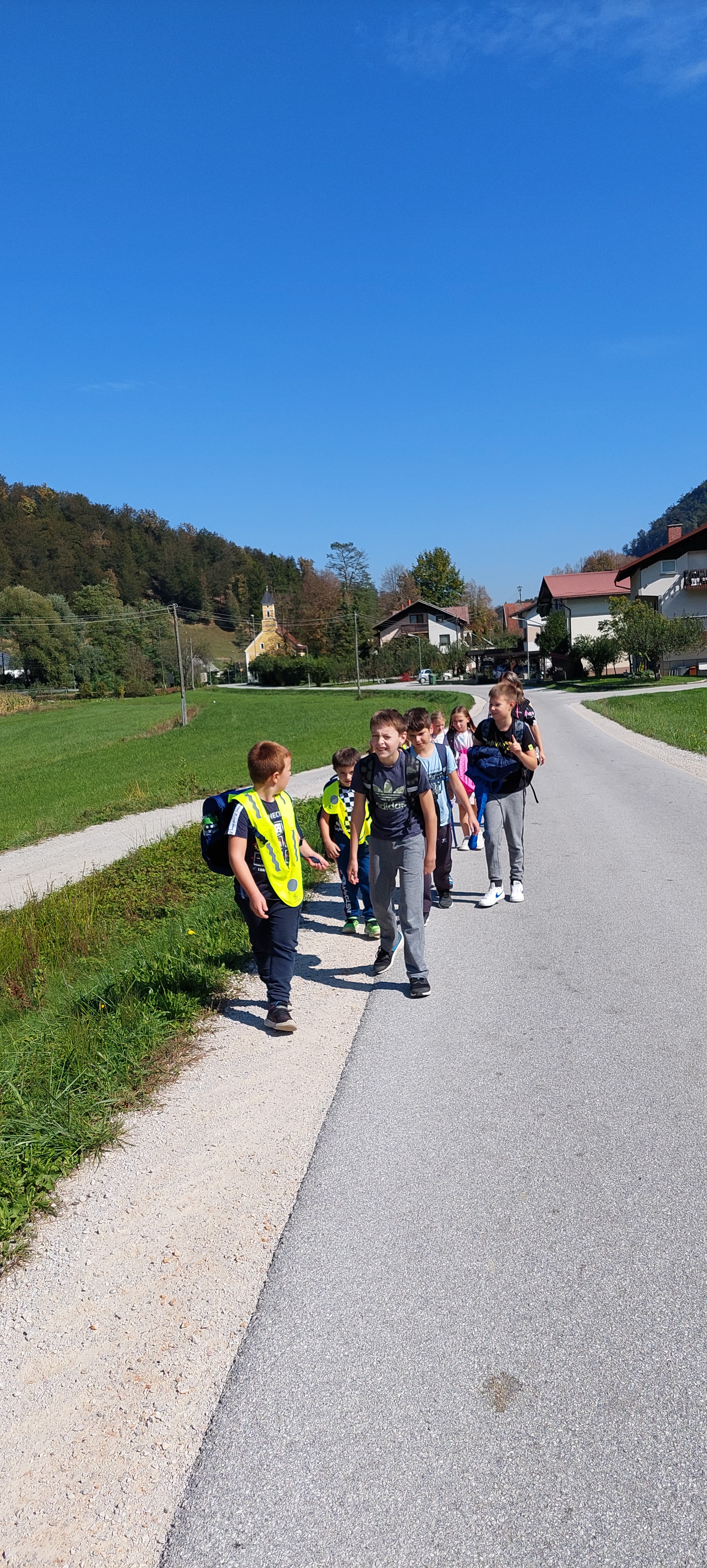 Peš iz šole pa smo se odpravili v ponedeljek, 23. 9. 2024. Po dobrem kosilu smo na ramena obesili malce lažje torbice in se podali na pot. Koliko nas je bilo pogumnežev? Deset ter učiteljici Jasmina in Frida. S hitrimi koraki smo drveli proti Dobrini, po poti pa seveda klepetali, se smejali, uživali na svežem zraku in nihče ni niti pomislil na dolžino poti.