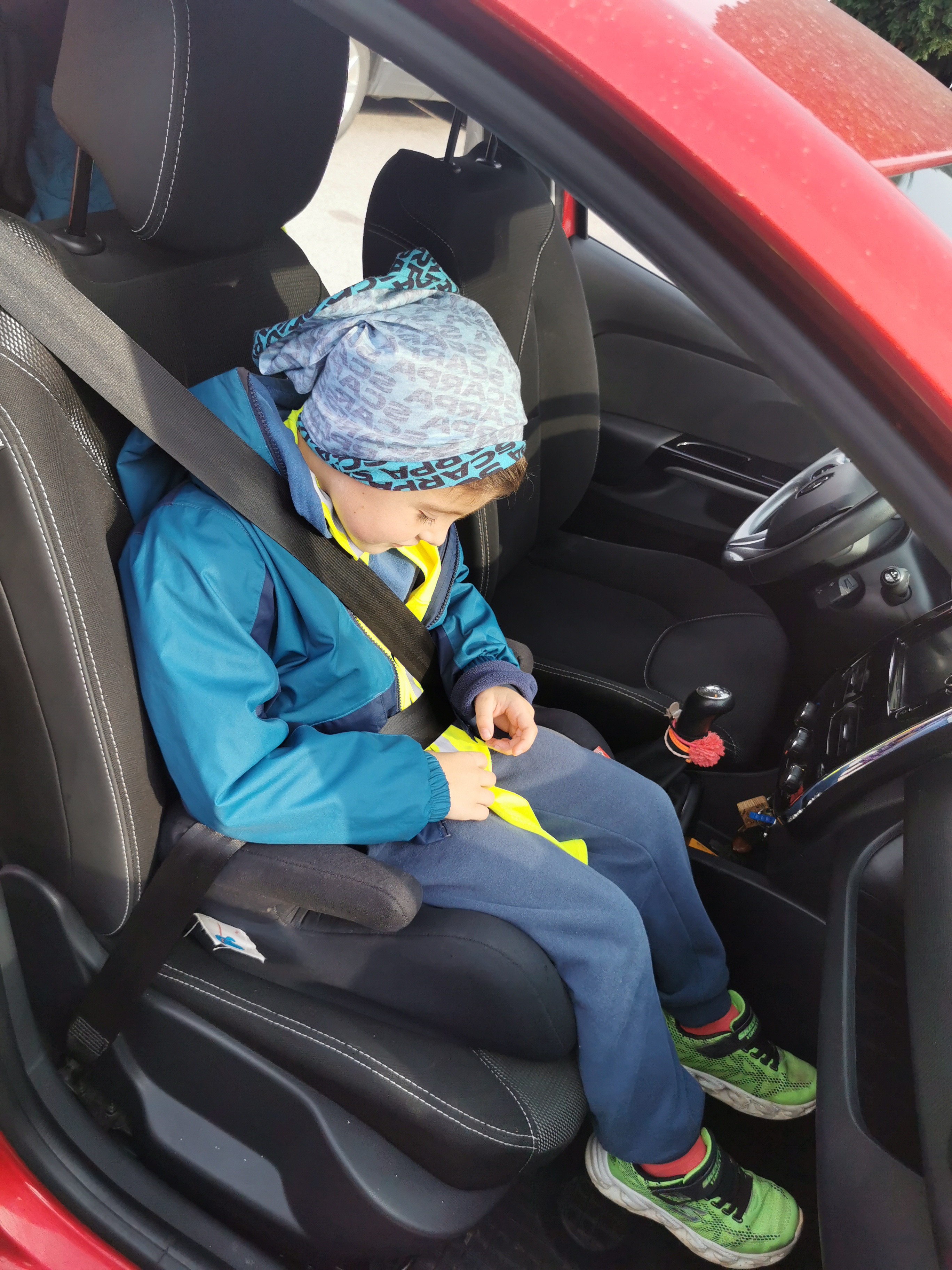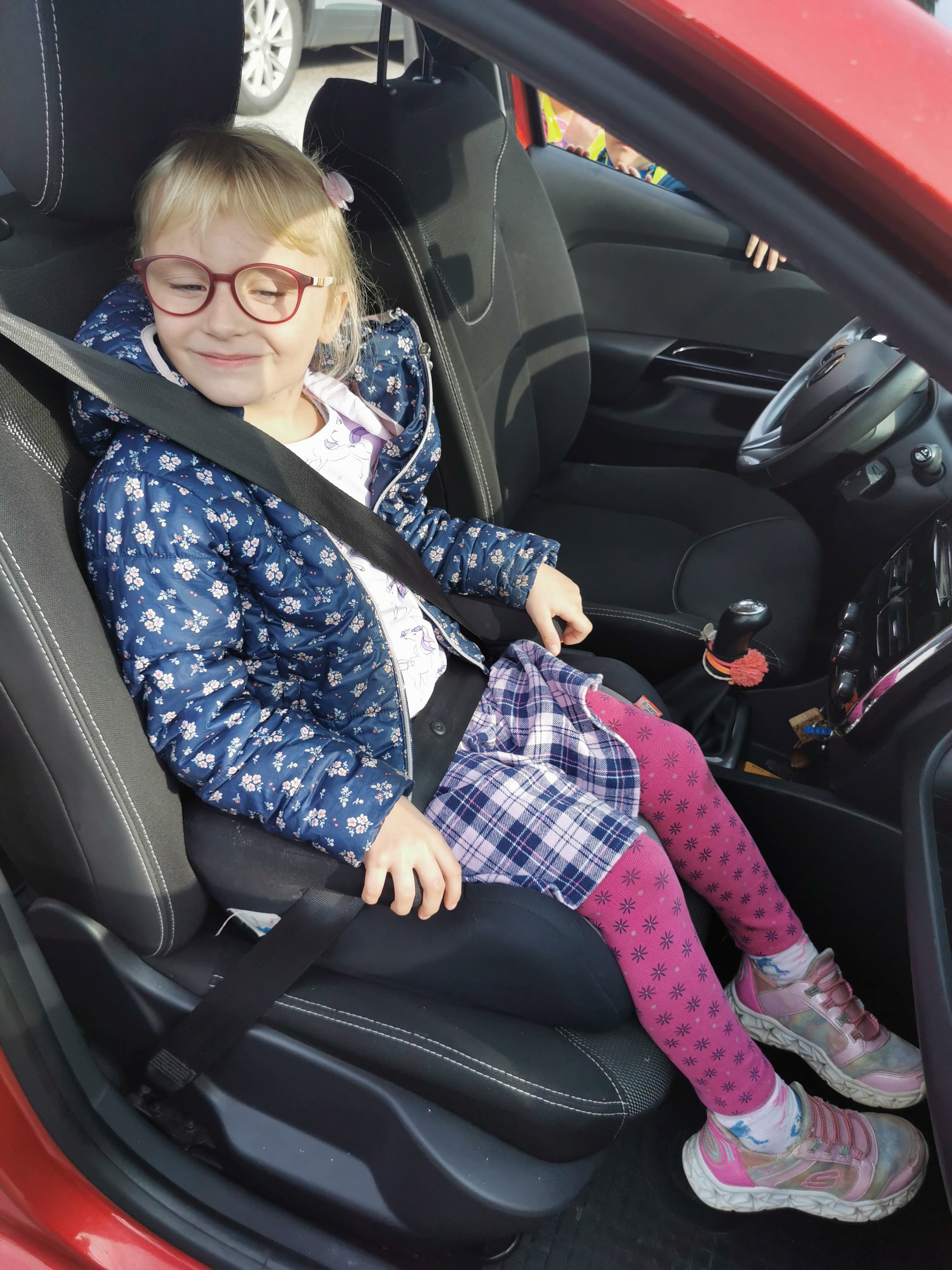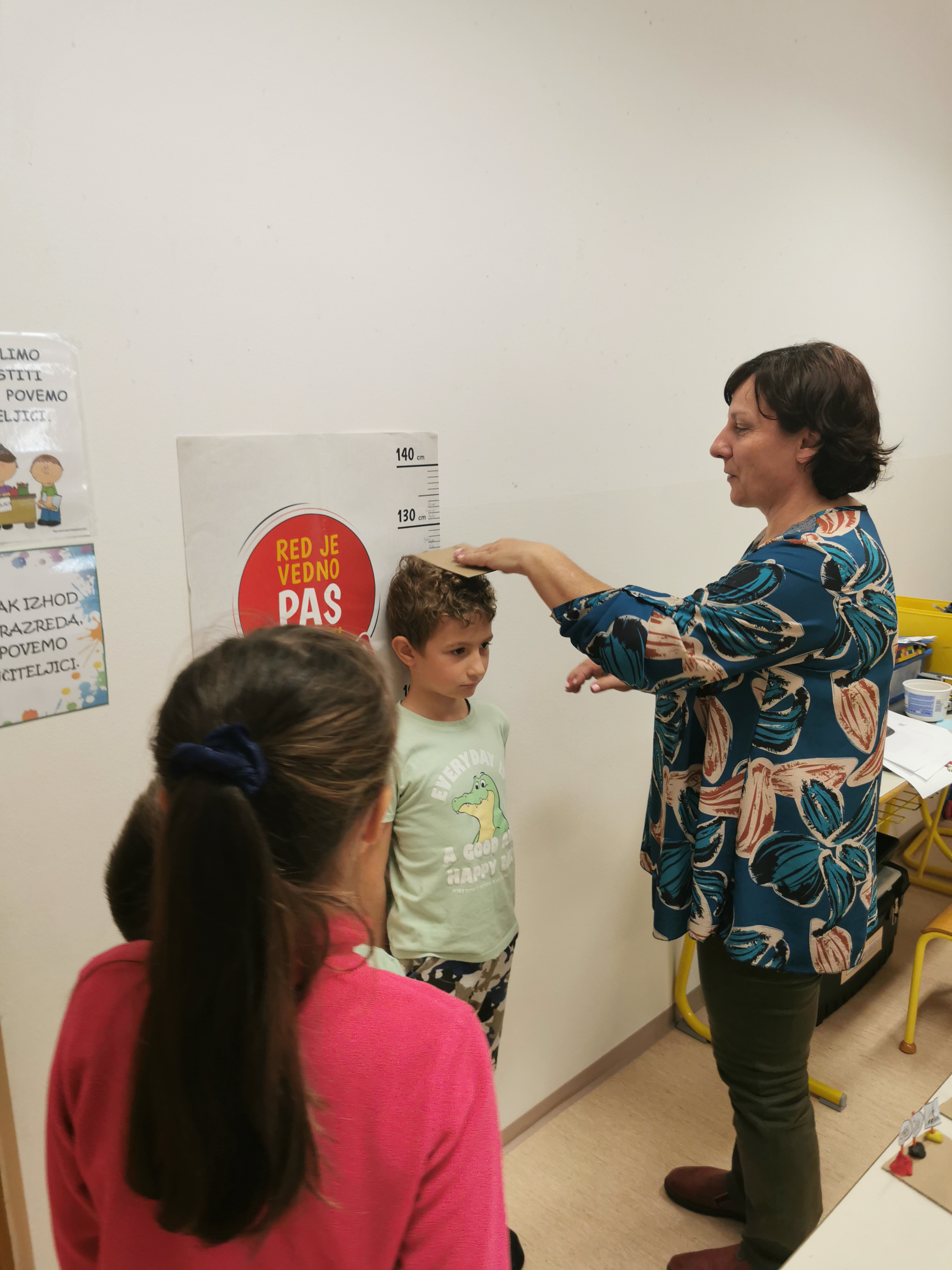 Z učiteljico so izmerili tudi svojo višino in ugotovili, kateri otroški sedež morajo uporabljati v avtomobilu. To so učenci 1. razreda v avtomobilu tudi praktično preizkusili.