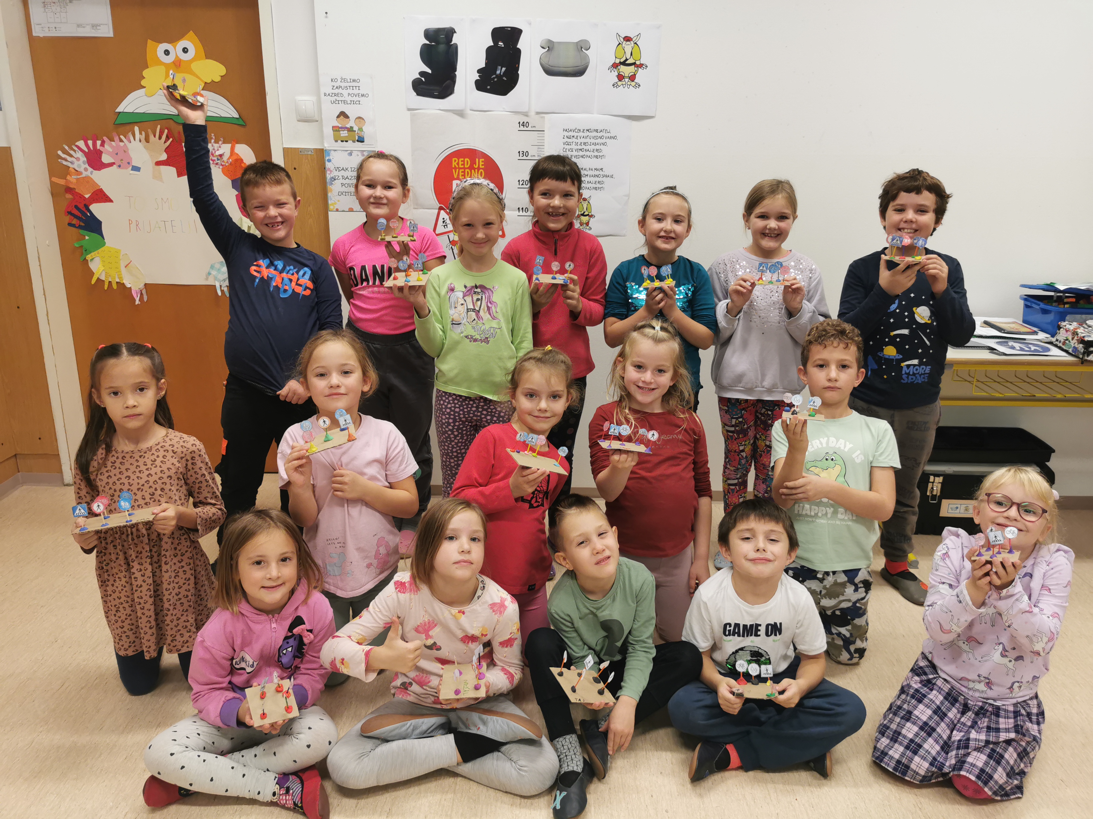 Na začetku so spoznali prijatelja Pasavčka in se ob gibanju naučili lepo poučno pesmico: RED JE VEDNO PAS PRIPET. Povedali so, če so pripeti, ko se peljejo v šolo in če so z varnostnim pasom pripeti tudi njihovi starši. Nato so ponovili znanje o prometnih znakih v okolici šole in jih tudi izdelali. Pri tem so bili zelo aktivni in ustvarjalni.