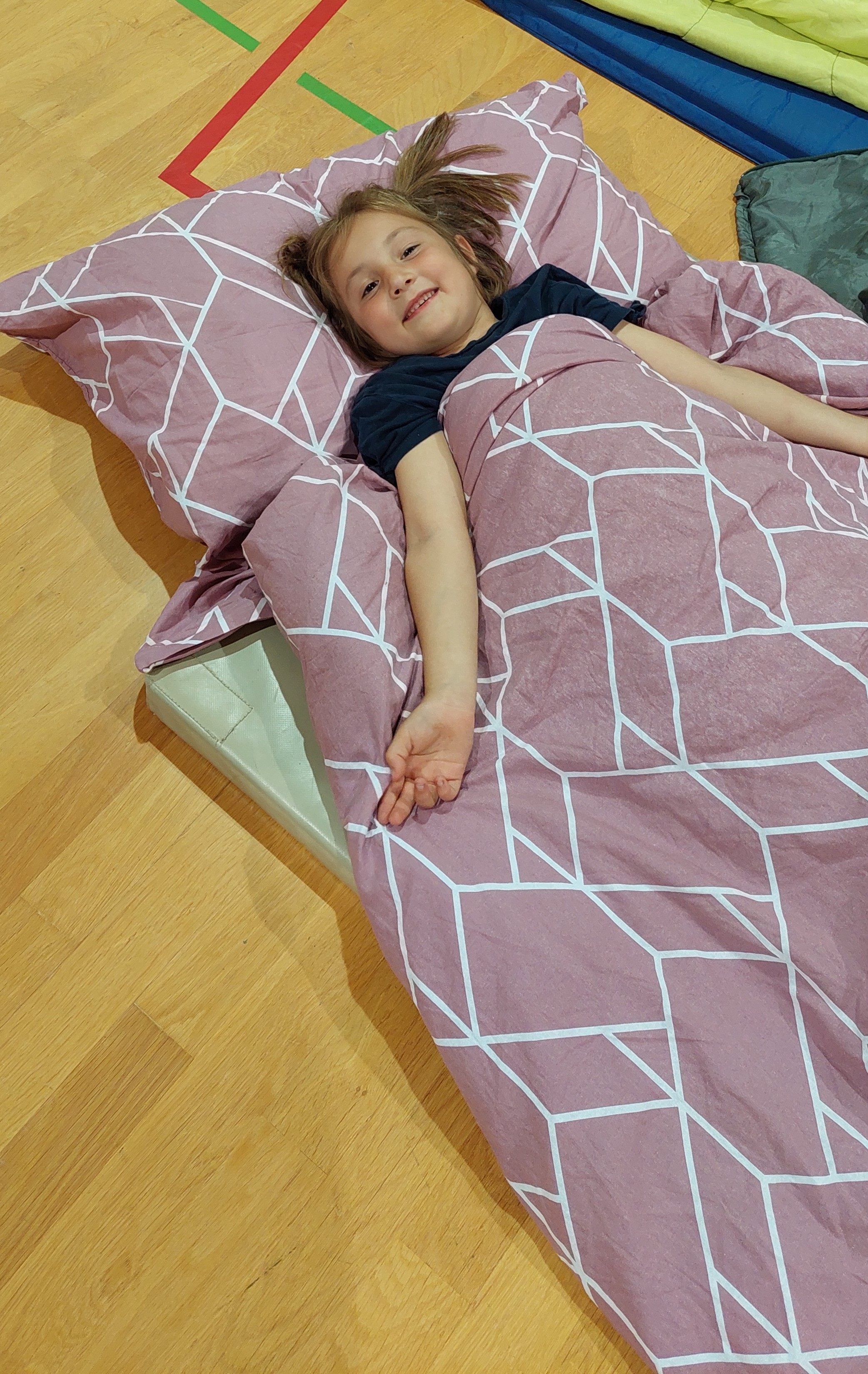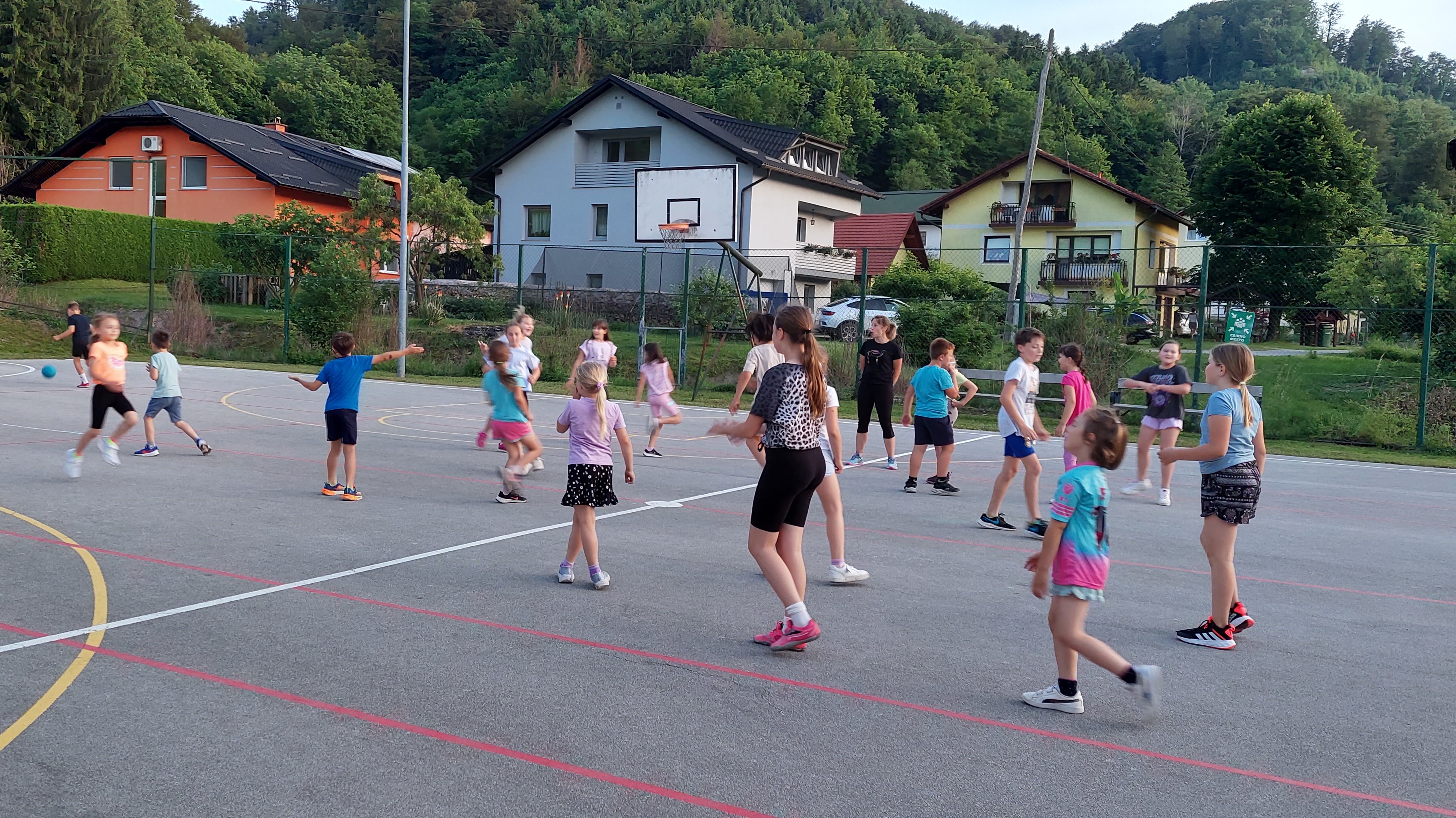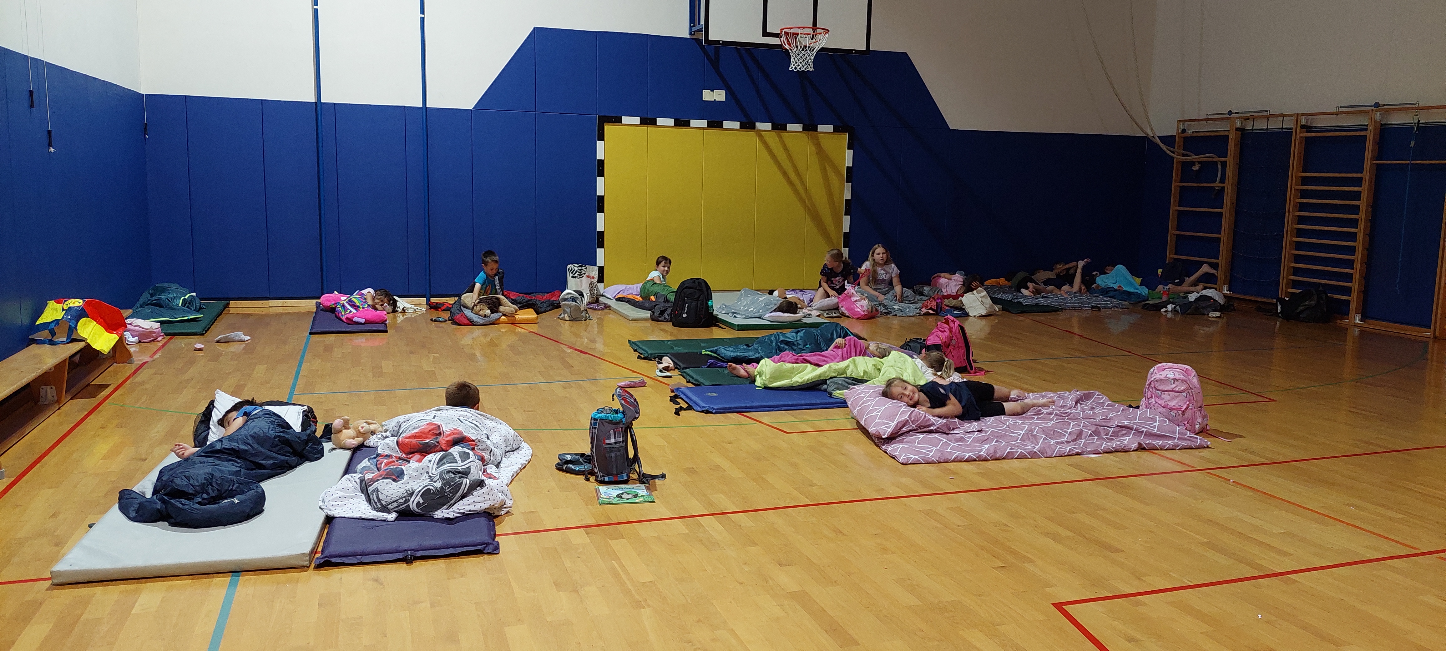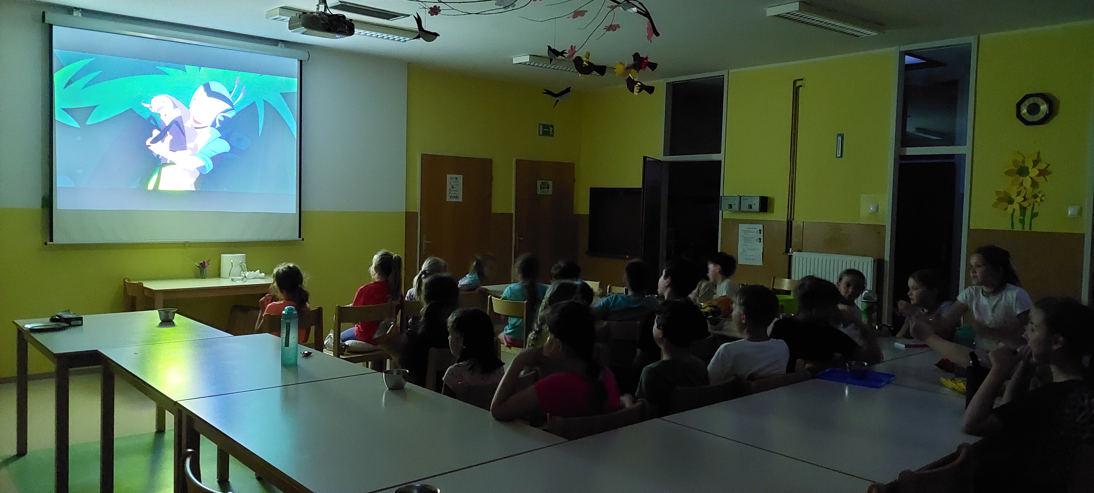 Stvari smo odložili v telovadnico, vzeli knjige in pripovedovanje najljubše pravljice se je pričelo. Sledila je večerja. Palačinke z marmelado so bile slastne, trebuščki polni in potrebna je bila telovadba. Odšli smo na igrišče, kjer smo igrali hokej ter med dvema ognjema. Pričelo se je temniti in odšli smo v jedilnico, kjer smo imeli kino. Uživali smo, a utrujenost je bila po napornem tednu velika, zato smo kaj kmalu odšli v telovadnico in si pripravili ležišča. Poskrbeli smo za osebno higieno, poslušali pravljice ter počasi drug za drugim zaspali.