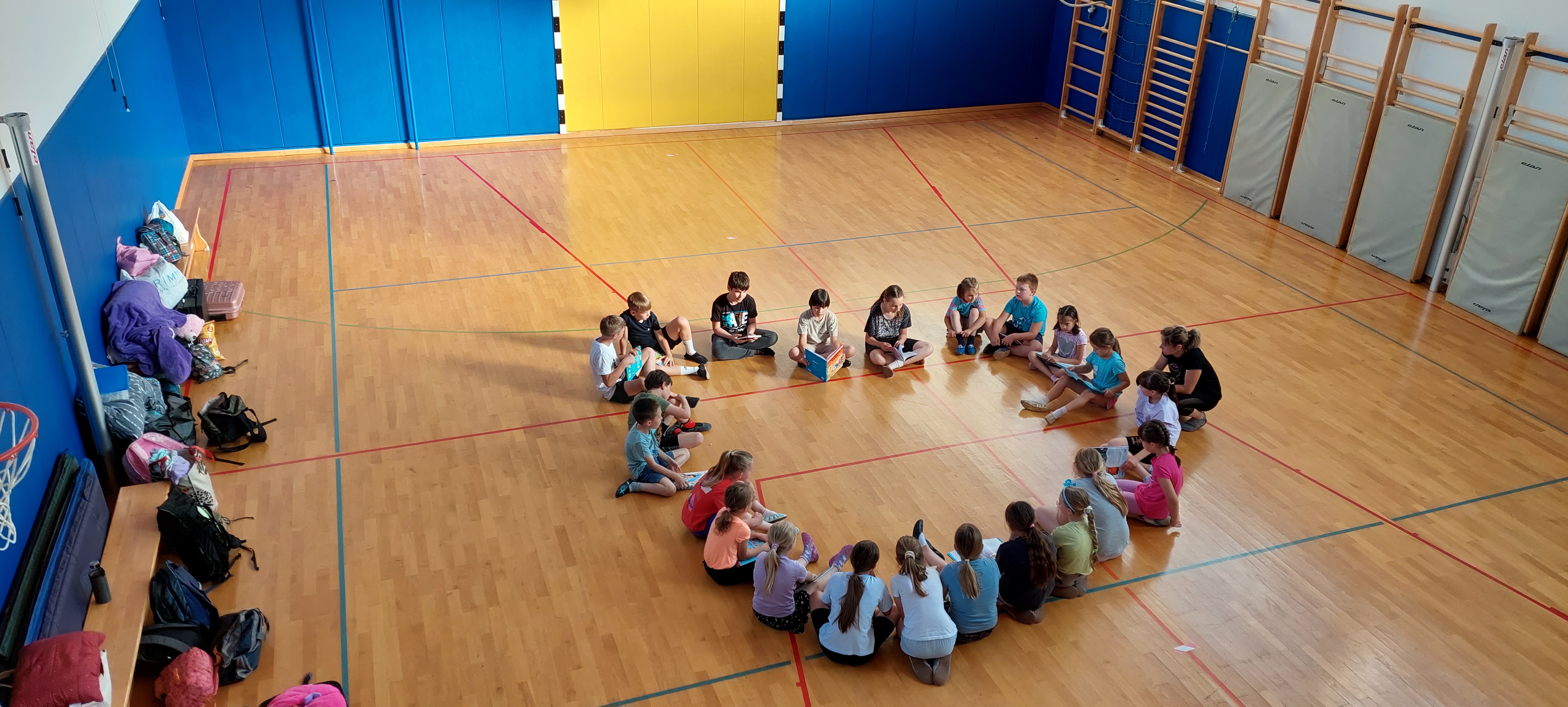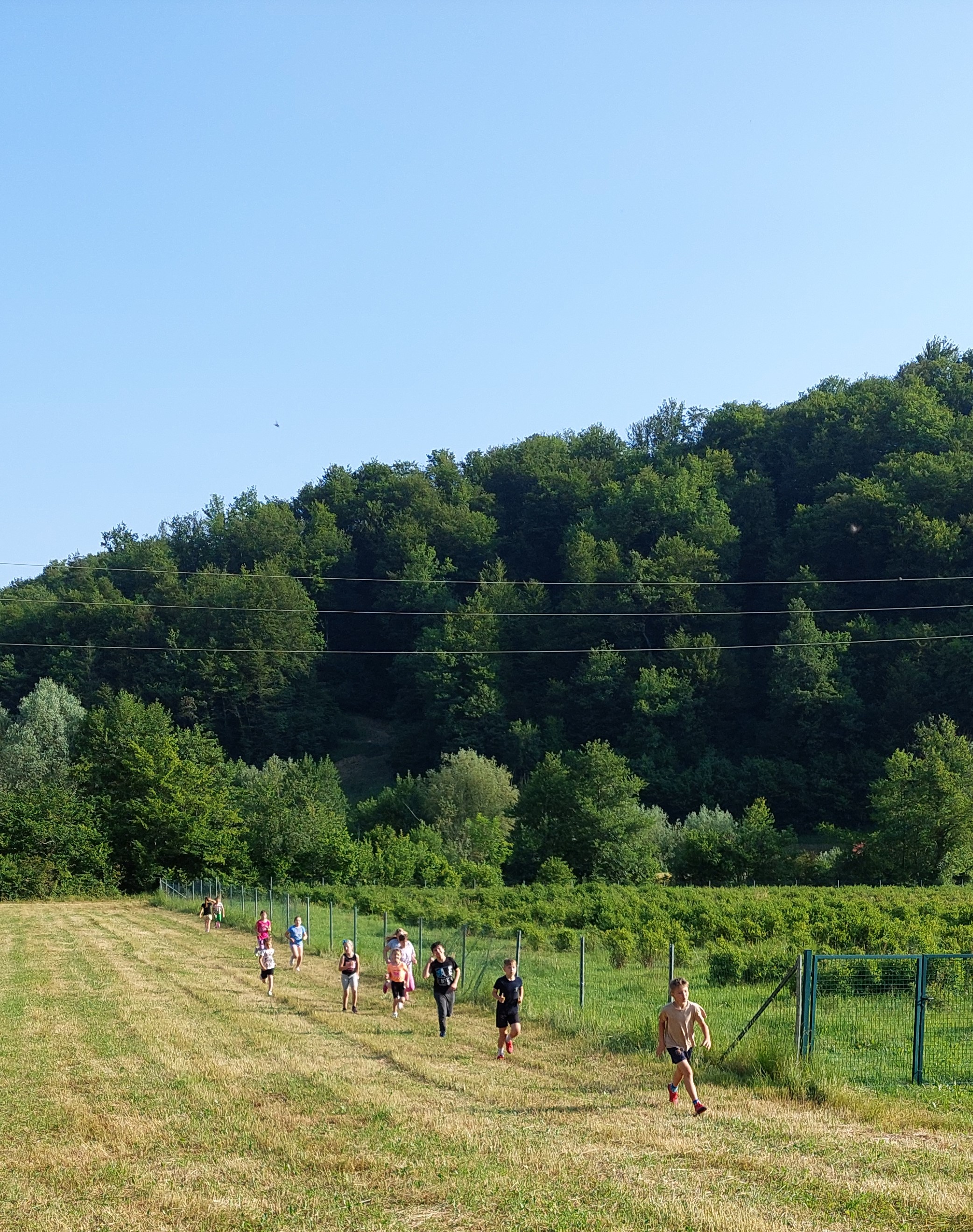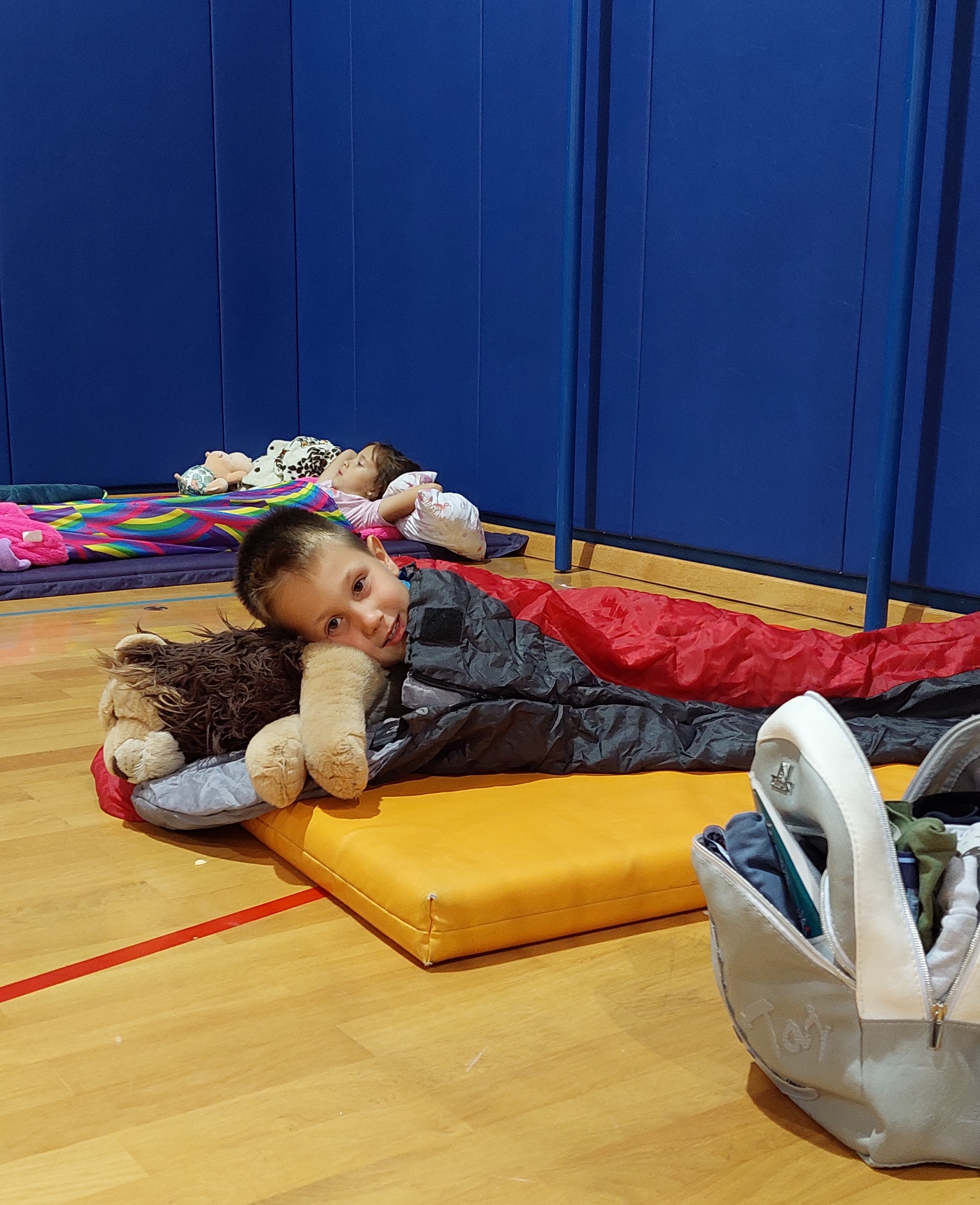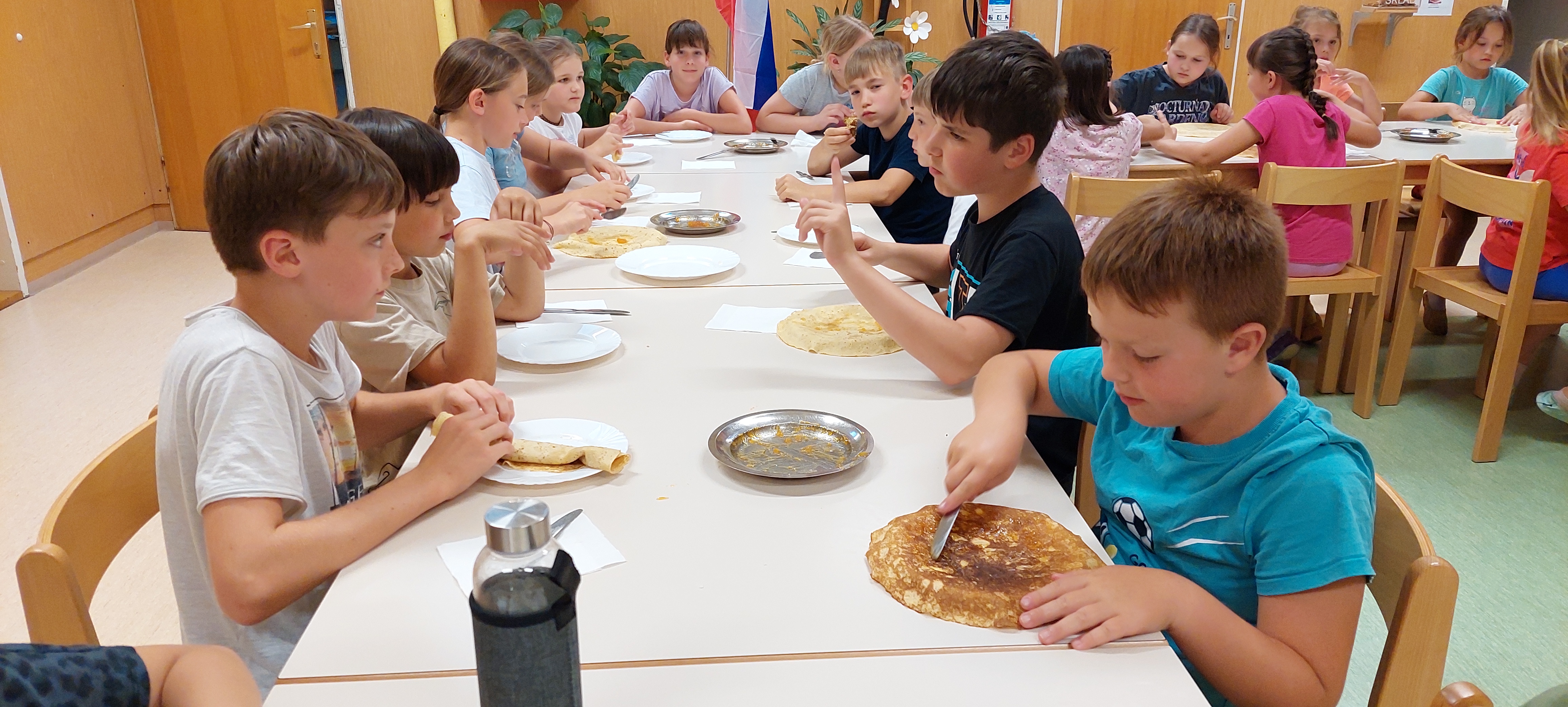 Stvari smo odložili v telovadnico, vzeli knjige in pripovedovanje najljubše pravljice se je pričelo. Sledila je večerja. Palačinke z marmelado so bile slastne, trebuščki polni in potrebna je bila telovadba. Odšli smo na igrišče, kjer smo igrali hokej ter med dvema ognjema. Pričelo se je temniti in odšli smo v jedilnico, kjer smo imeli kino. Uživali smo, a utrujenost je bila po napornem tednu velika, zato smo kaj kmalu odšli v telovadnico in si pripravili ležišča. Poskrbeli smo za osebno higieno, poslušali pravljice ter počasi drug za drugim zaspali.