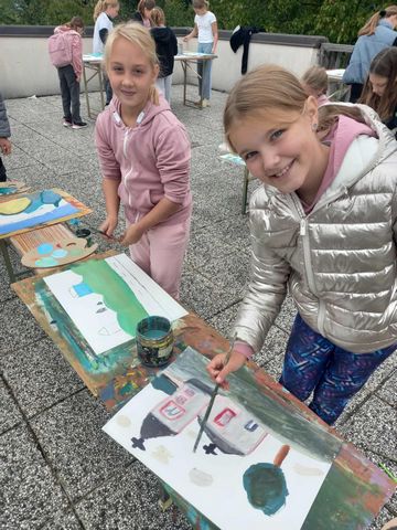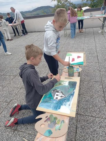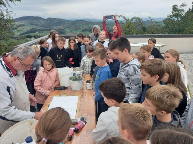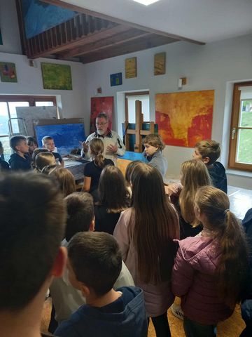 Kljub oblačnemu vremenu je bilo vzdušje že od jutra toplo in prijetno. Mladi umetniki so dan začeli s slastnimi palačinkami in toplim čajem, ki je prijetno ogrel njihove dlani in srca. Po okrepčilu so si ogledali slikarjev atelje, kjer jim je gospod Orač predstavil svoje delo, pripomočke in navdihujoče zgodbe iz sveta likovne umetnosti.