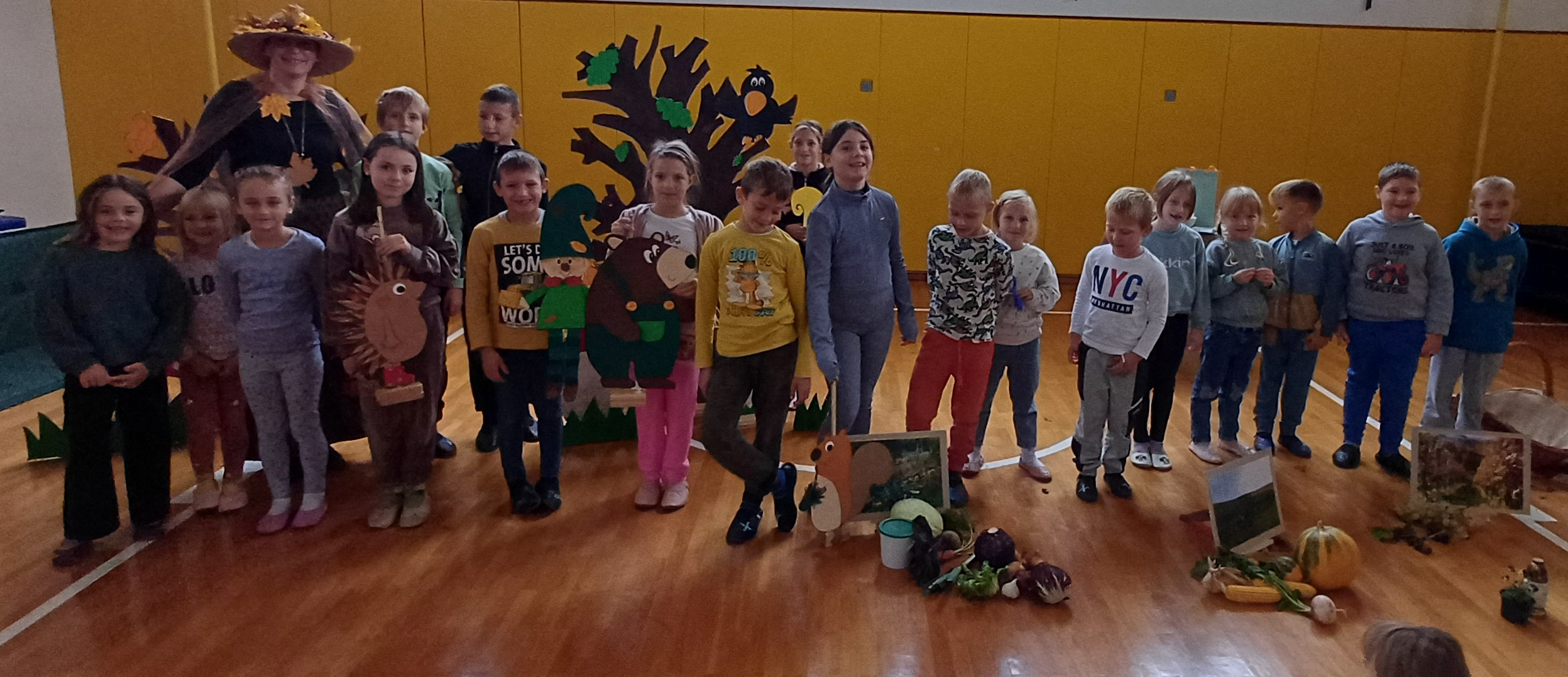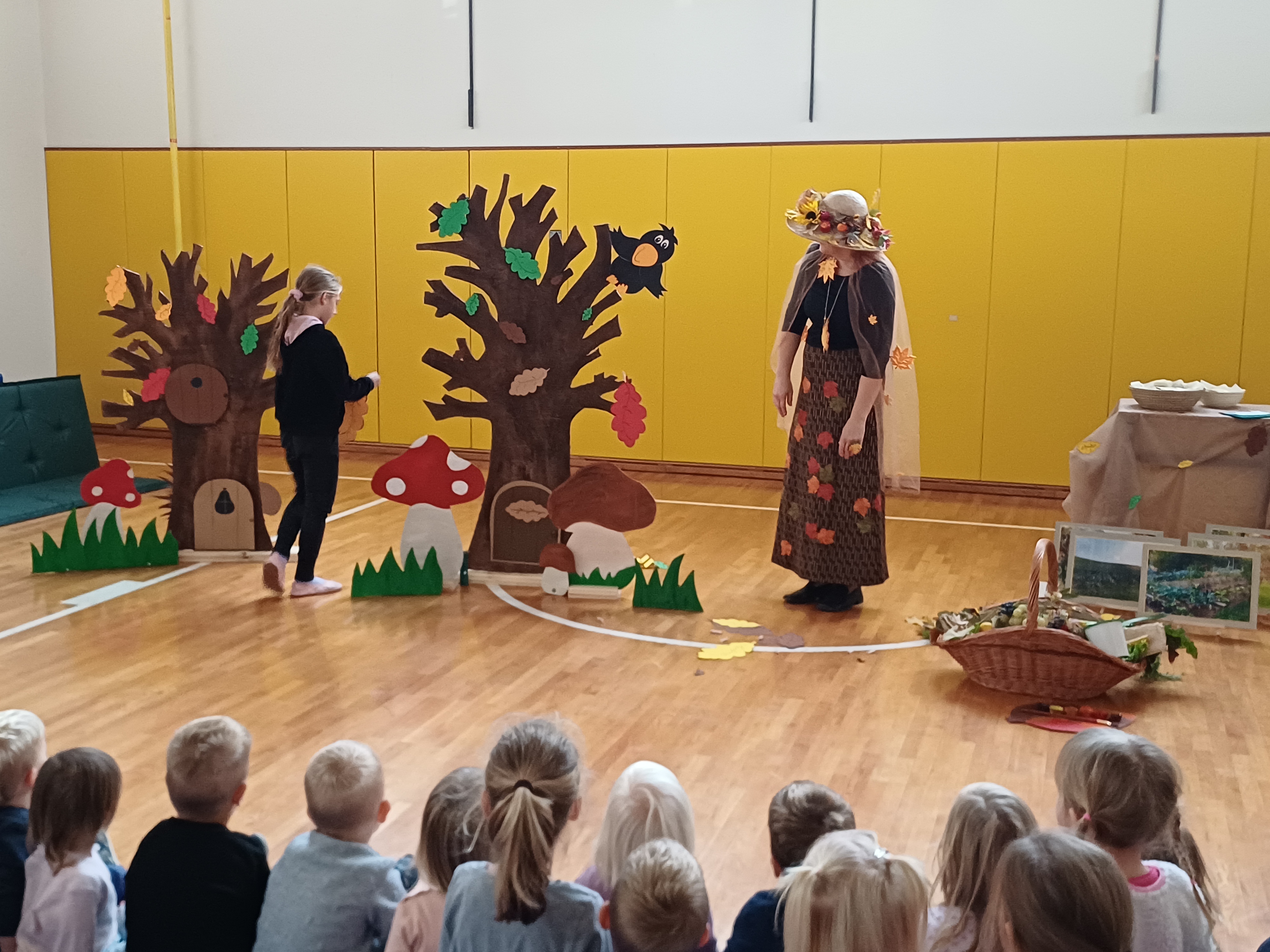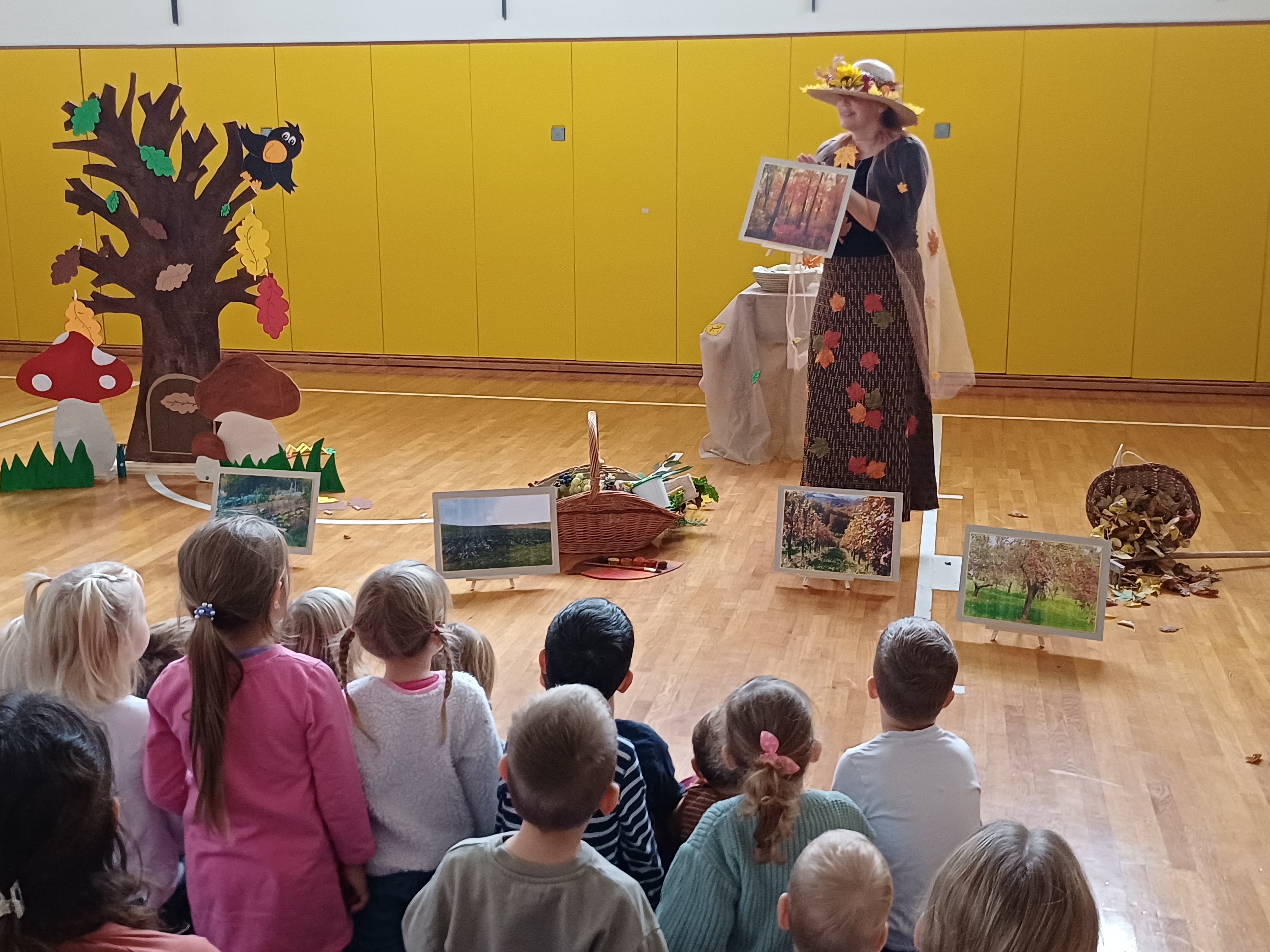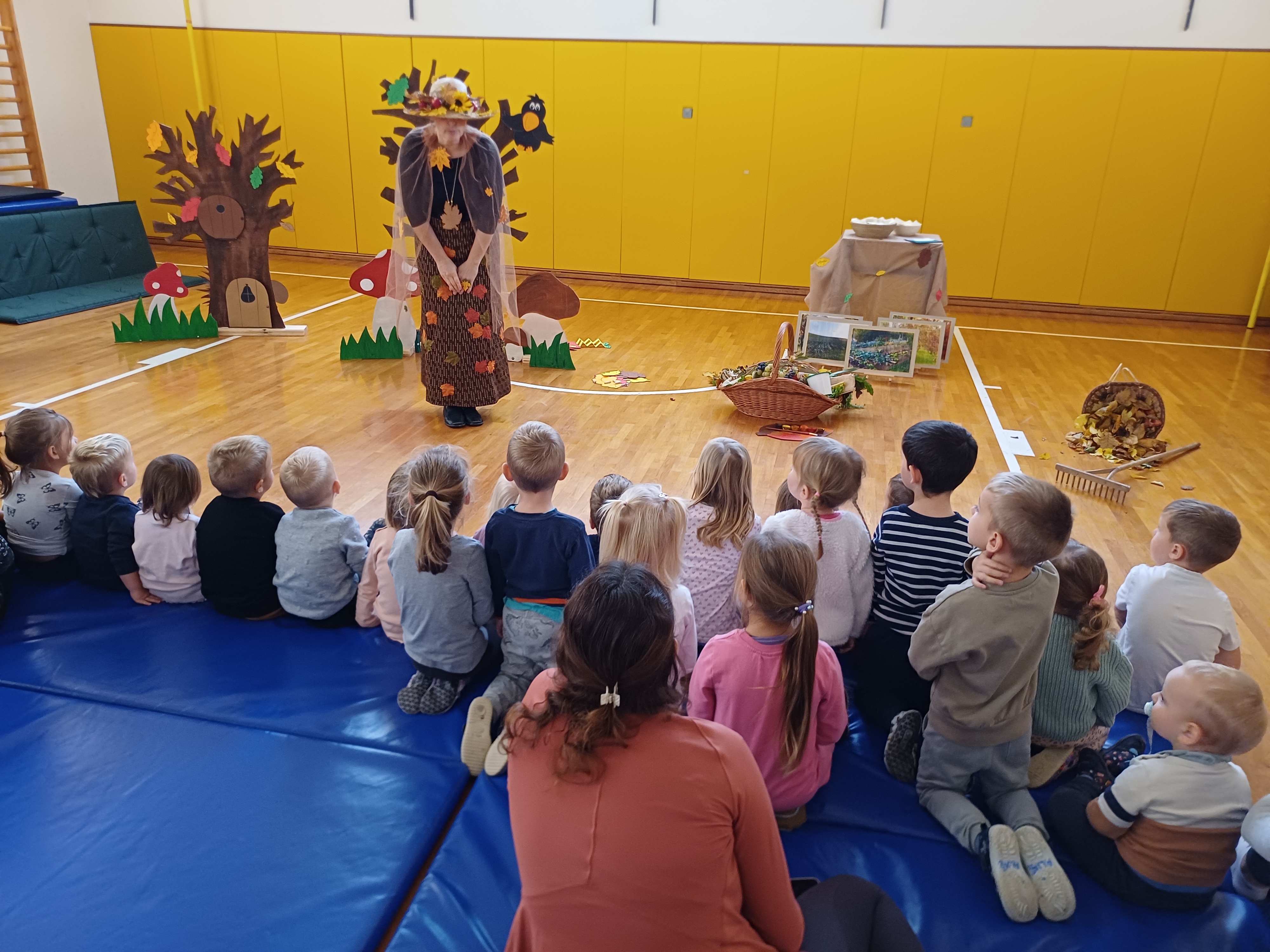 Naš vsakdan pa je v tem tednu polepšal še prav poseben obisk – v šolo in vrtec je prikorakala nasmejana Tetka Jesen, obdana z listjem, pisanimi barvami in jesenskimi pridelki. Otroci so jo z navdušenjem pozdravili in uživali v zanimivi predstavi. Skupaj smo zapeli jesenske pesmi in začutili pravo jesensko vzdušje, ki ga je dopolnila tudi njena čudovita dekoracija in scena. Bilo je toplo, prijetno in nepozabno srečanje z jesenjo v vsej njeni lepoti.