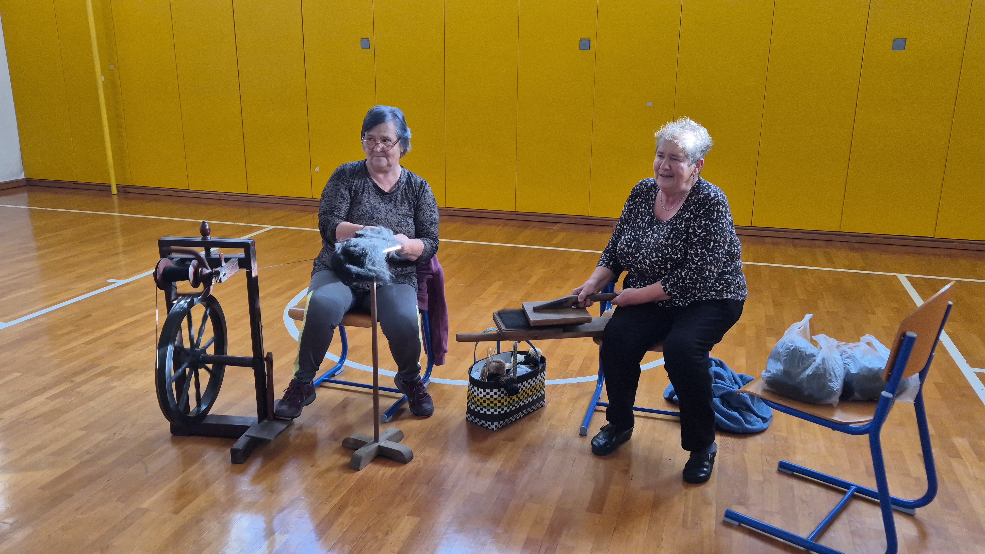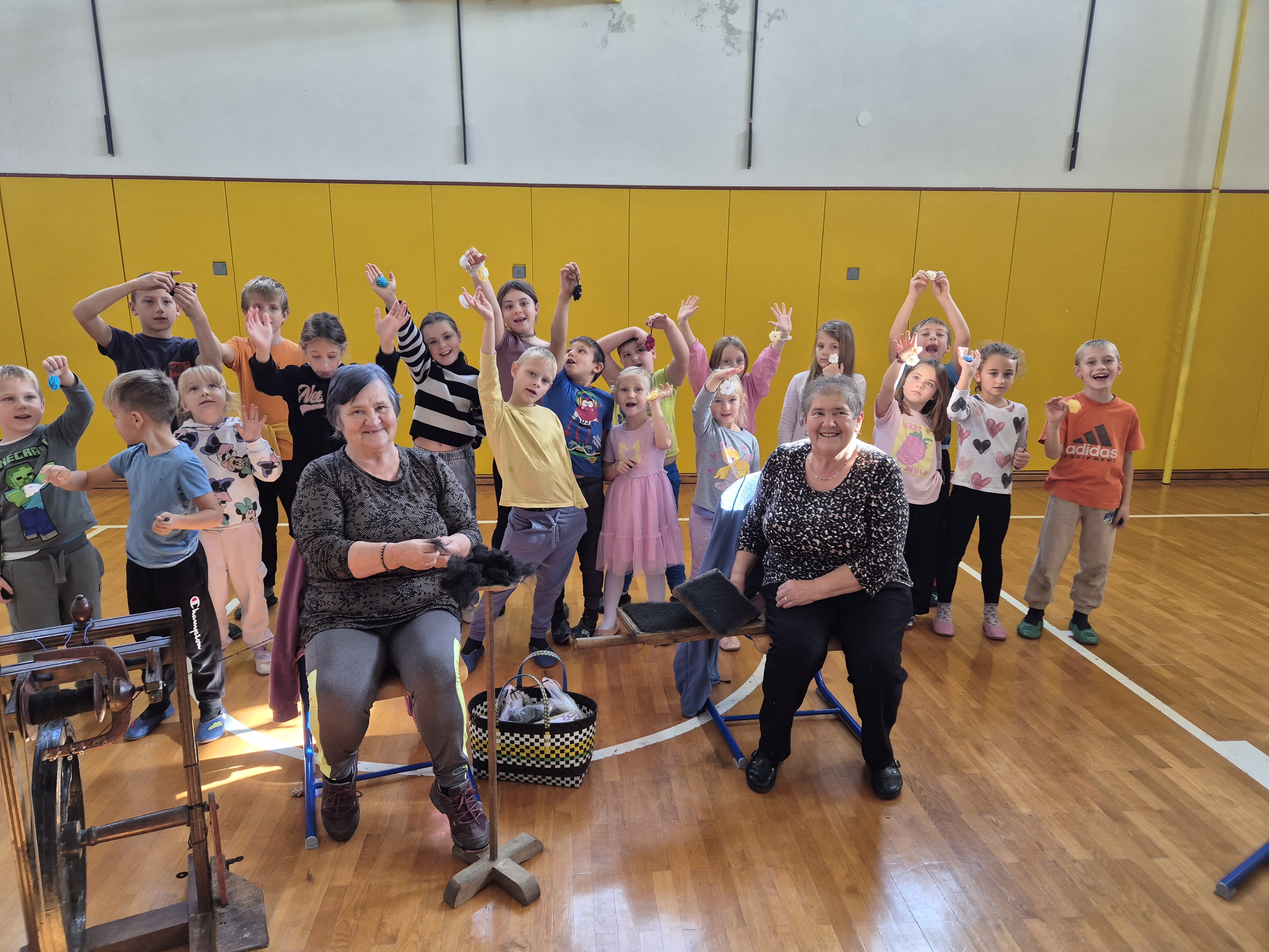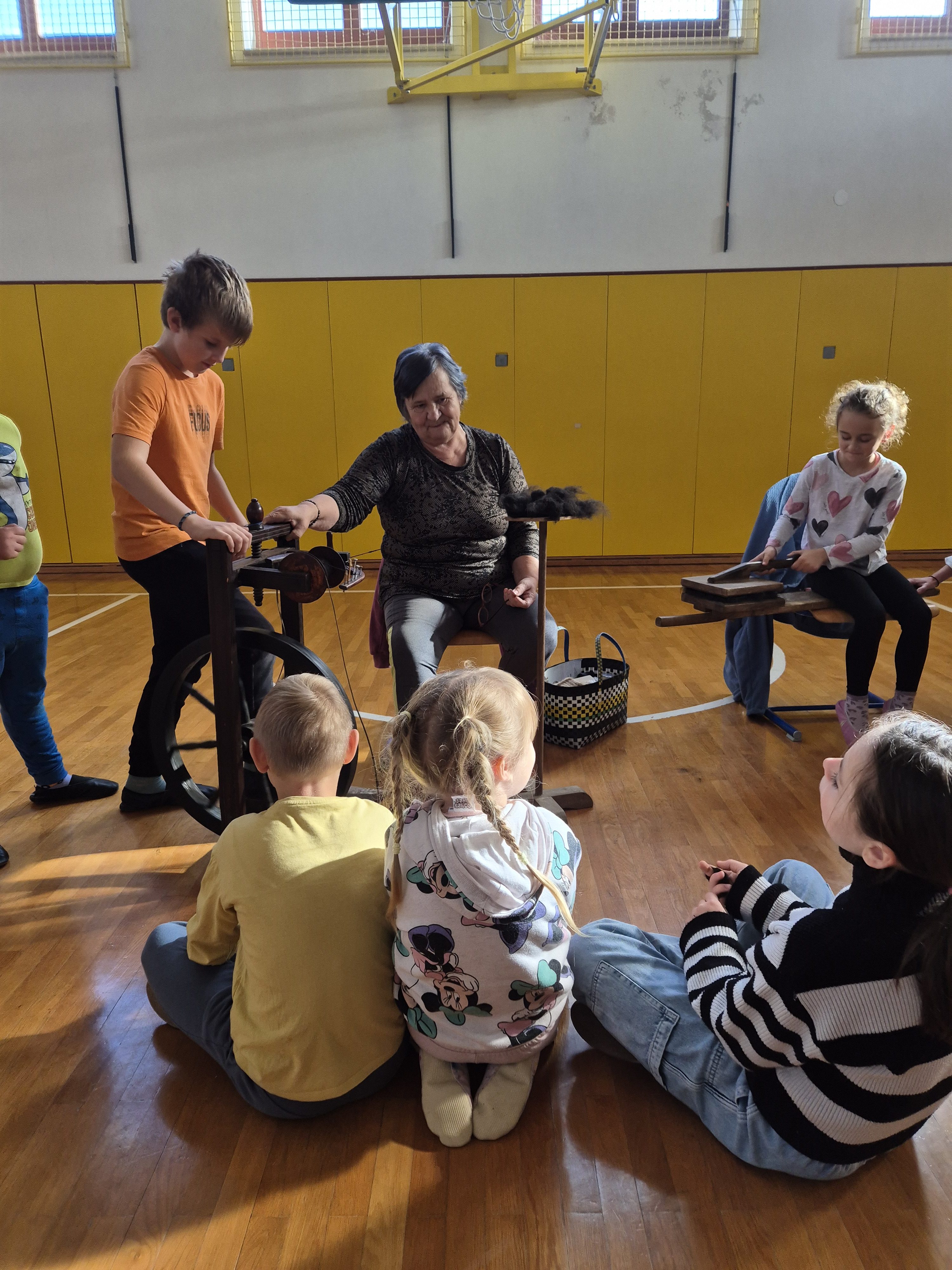 V telovadnici pa sta predici prikazali pot volne od ovce ali alpake do klobke. S kolovratom sta izdelali prejo, učenci pa so poskusili česati volno, vrteti kolovrat in spoznali, da je za lepo nit potrebna spretnost in veliko potrpežljivosti.