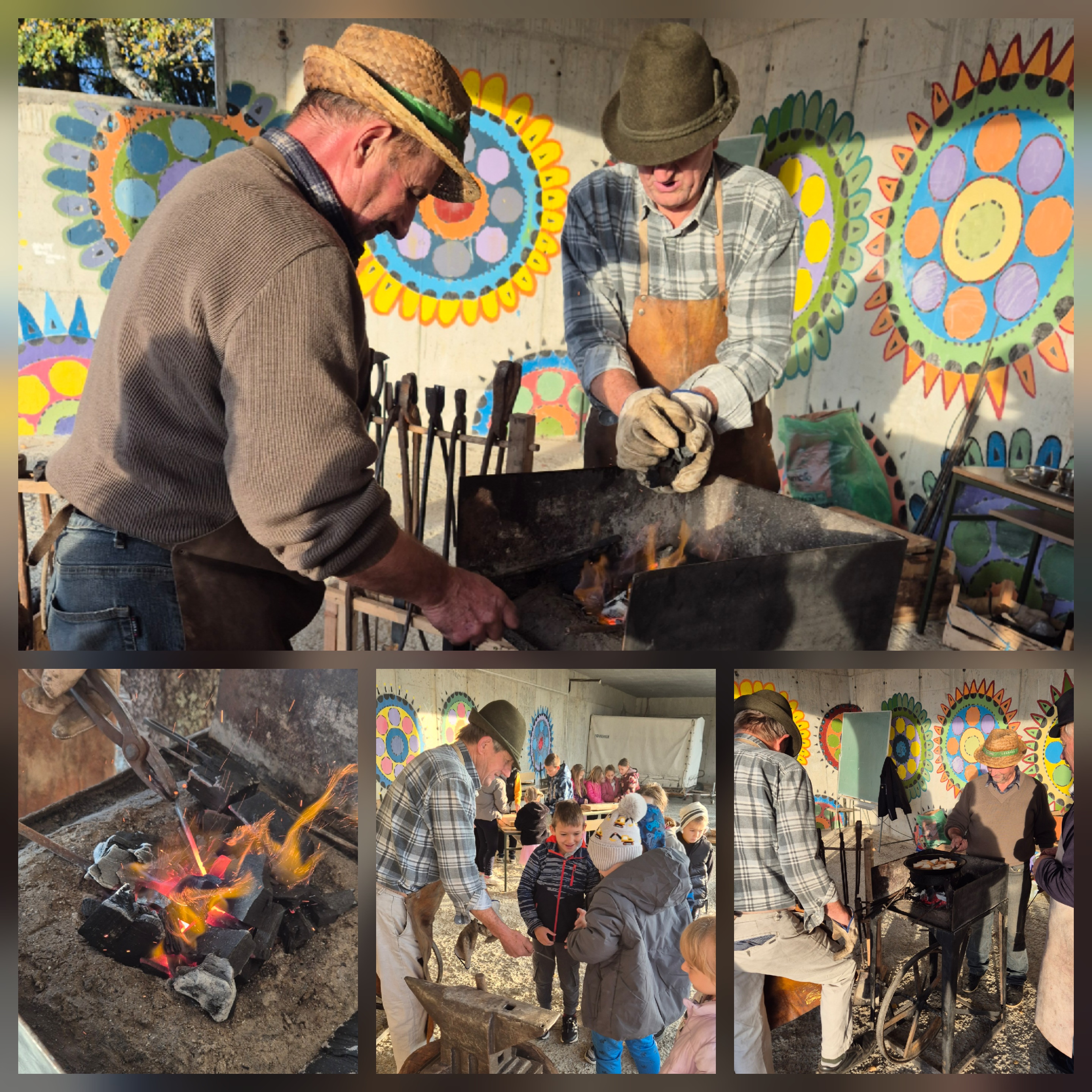 V šolski garaži so kovači pokazali, kako se segreva železo in kuje žeblje na pravem nakovalu. Učenci so si ogledali orodja, pomagali pri delu ter uživali ob peki klobas in jabolčnih mišk. Po njihovih besedah je bila to »najboljša malica na svetu«.