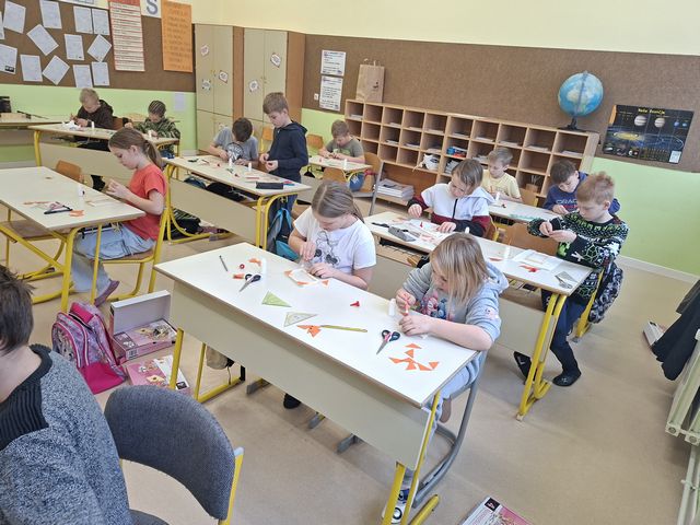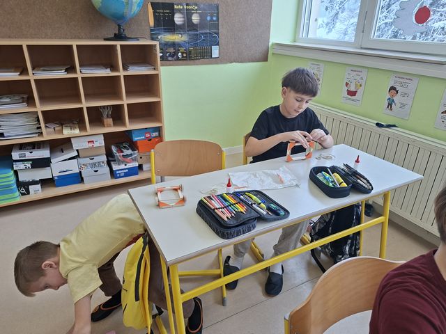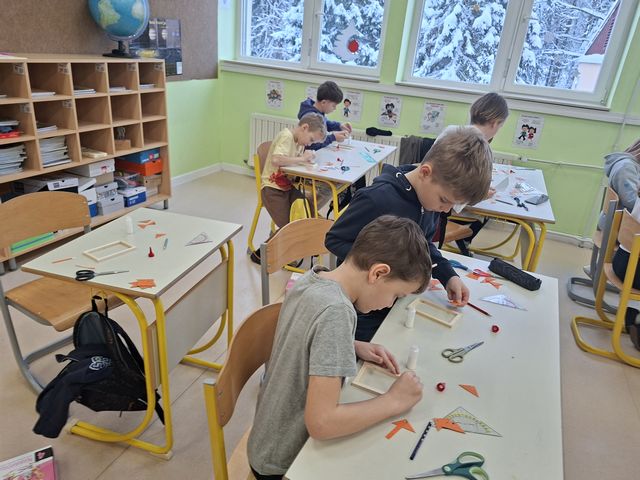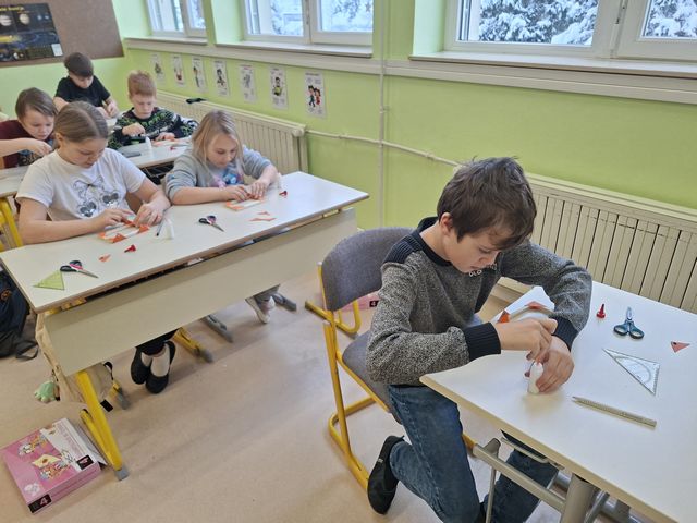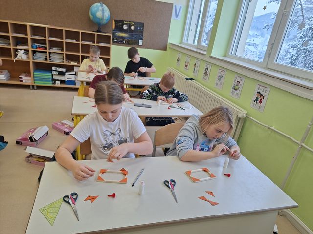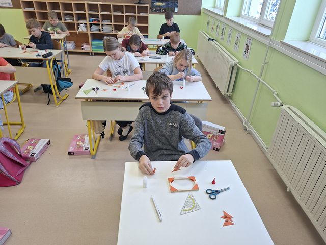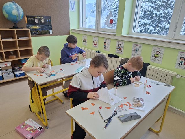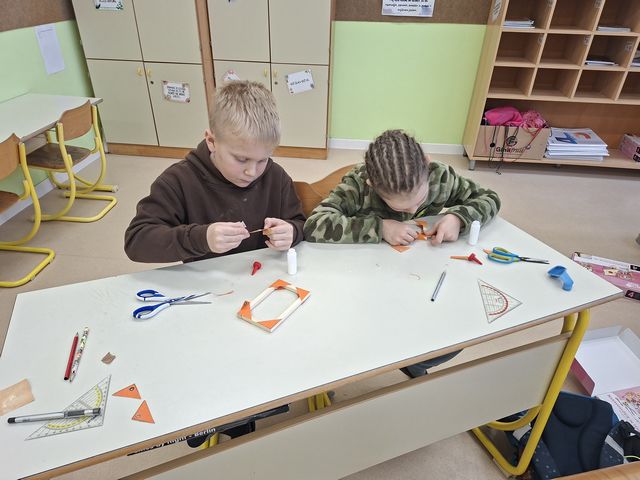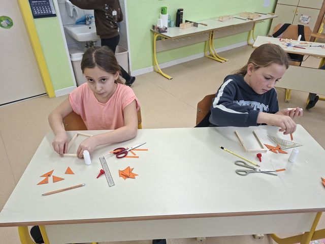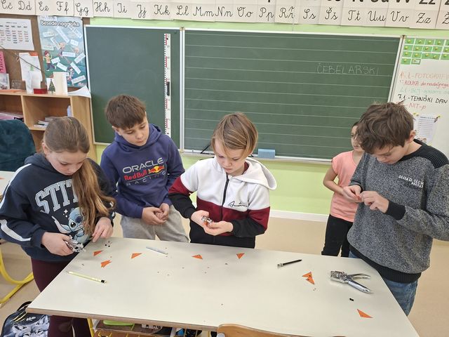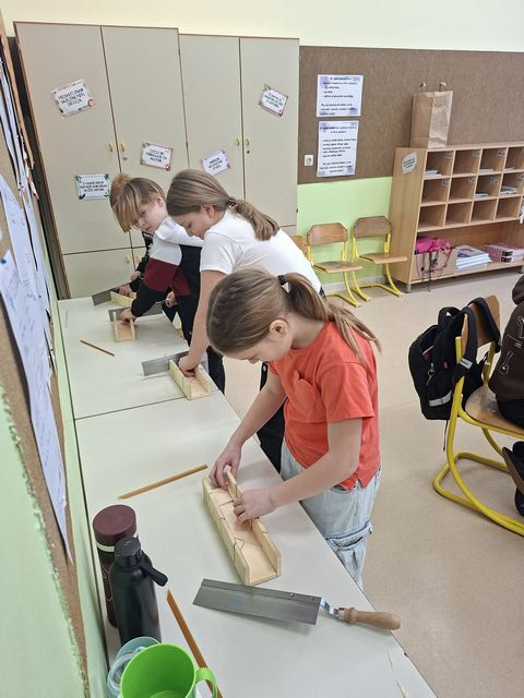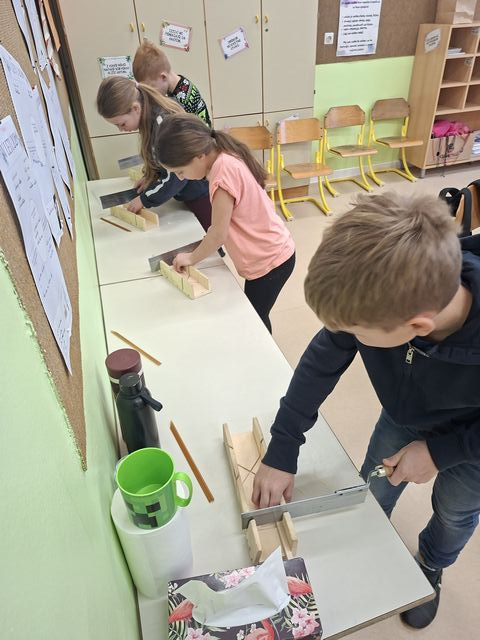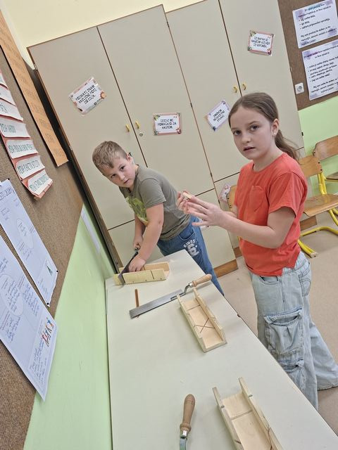 Med delom so učenci spoznavali različna orodja in tehnike. Hitro so ugotovili, da je lepenko z otroškimi škarjami precej težje rezati kot papir. Preizkusili so klešče za luknjanje in kovičenje, s katerimi so najprej naredili luknje, nato pa jih zakovičili. Z ročno žago so morali odžagati letvico – nekaterim je to šlo kot po maslu, drugi so se morali malo bolj potruditi, a obupal ni nihče. Letvice, ki so jih skrajšali, so nato še pobrusili z brusnim papirjem, da so bile gladke in primerne za lepljenje.