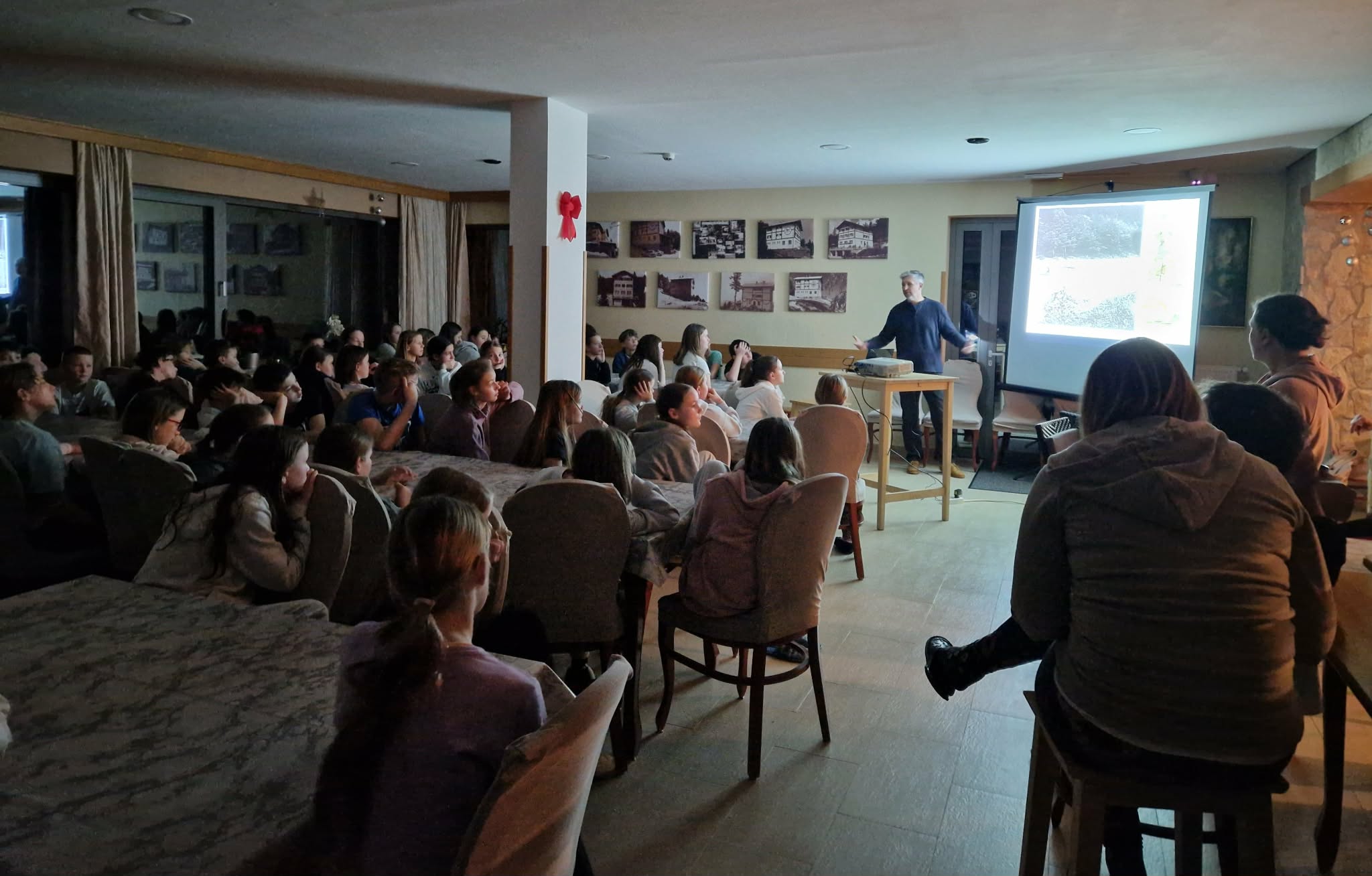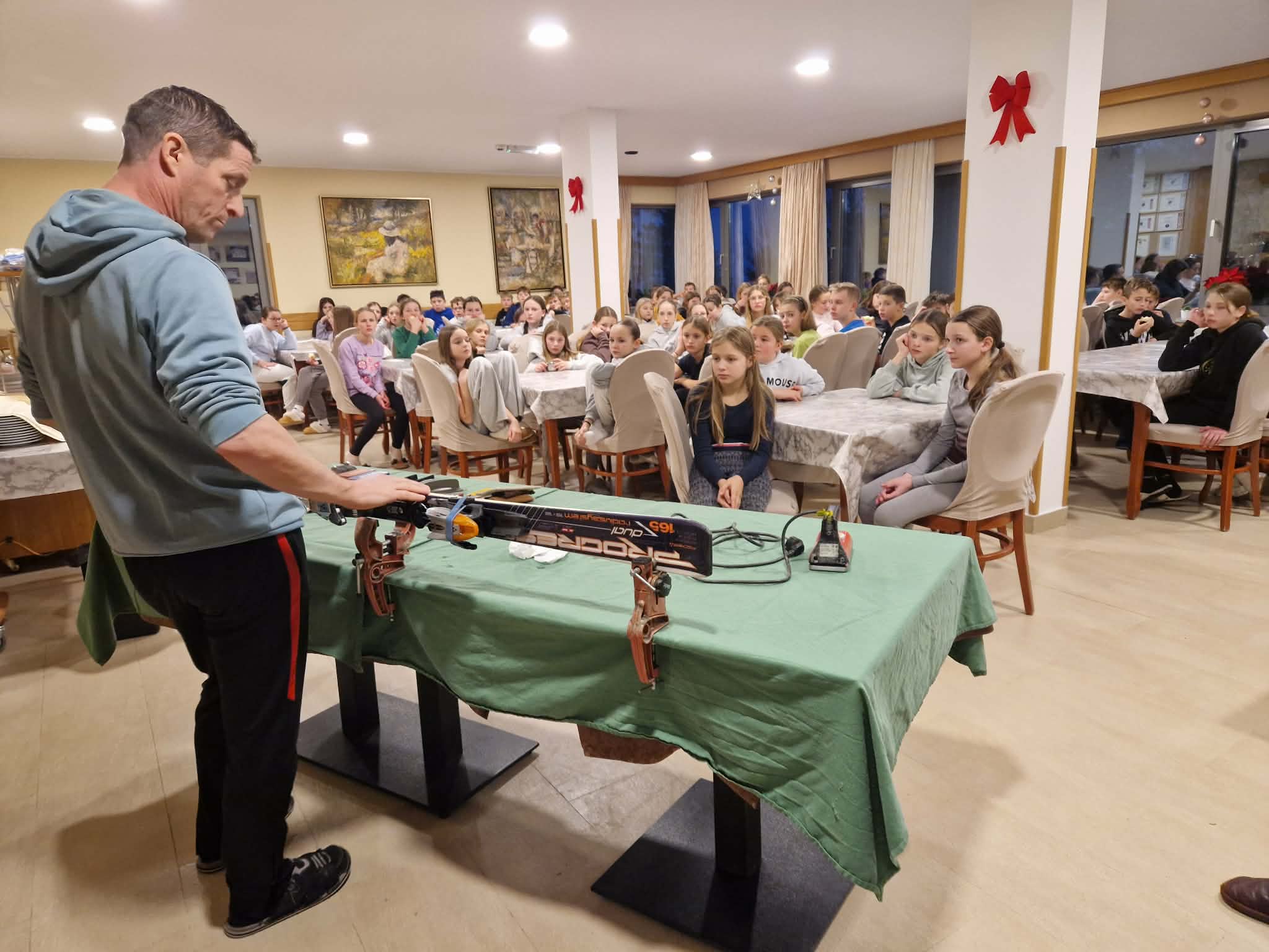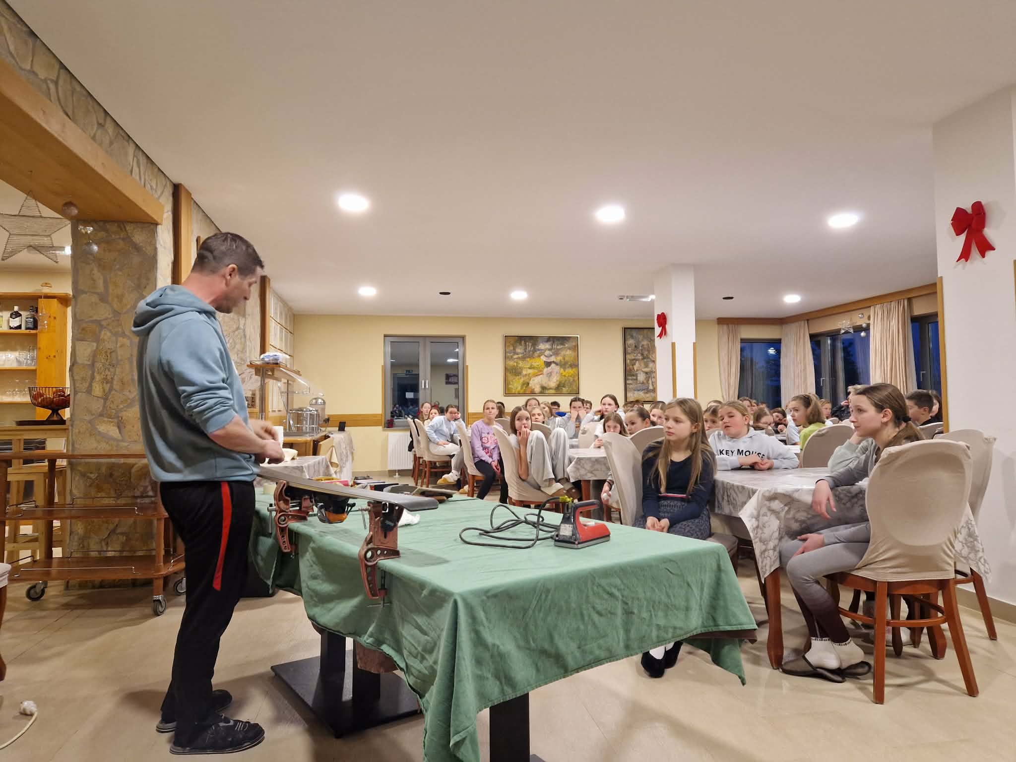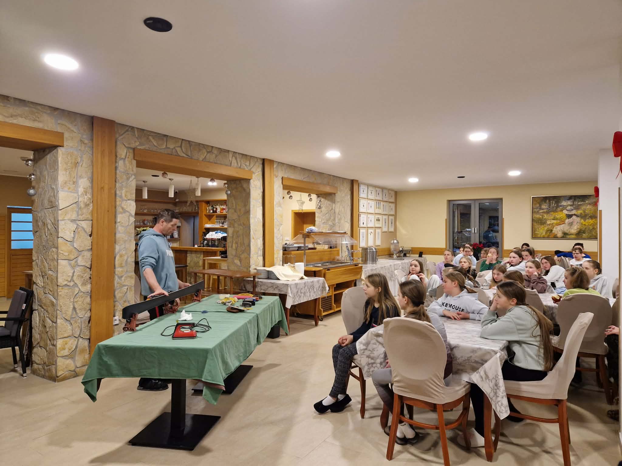 Zelo mrzlo jutro nas je pričakalo brez sneženja, a z jasnim zrakom in pravimi zimskimi temperaturami. Smučali smo na nekoliko drugačni podlagi, kar je od nas zahtevalo več zbranosti in prilagajanja, a smo se z izzivom uspešno spopadli. Kljub mrazu smo z vztrajnostjo in dobro voljo opravili vse smučarske ure. Popoldne nam je učitelj Matej predstavil, kako morajo biti pripravljene smuči za varno smuko. Zvečer pa smo spoznavali splavarjenje, se pogovorili o njegovi zgodovini, pomenu in varnosti na vodi ter izvedeli veliko zanimivosti o življenju ob rekah. Dan smo zaključili mirneje, prijetno utrujeni in polni novih znanj.